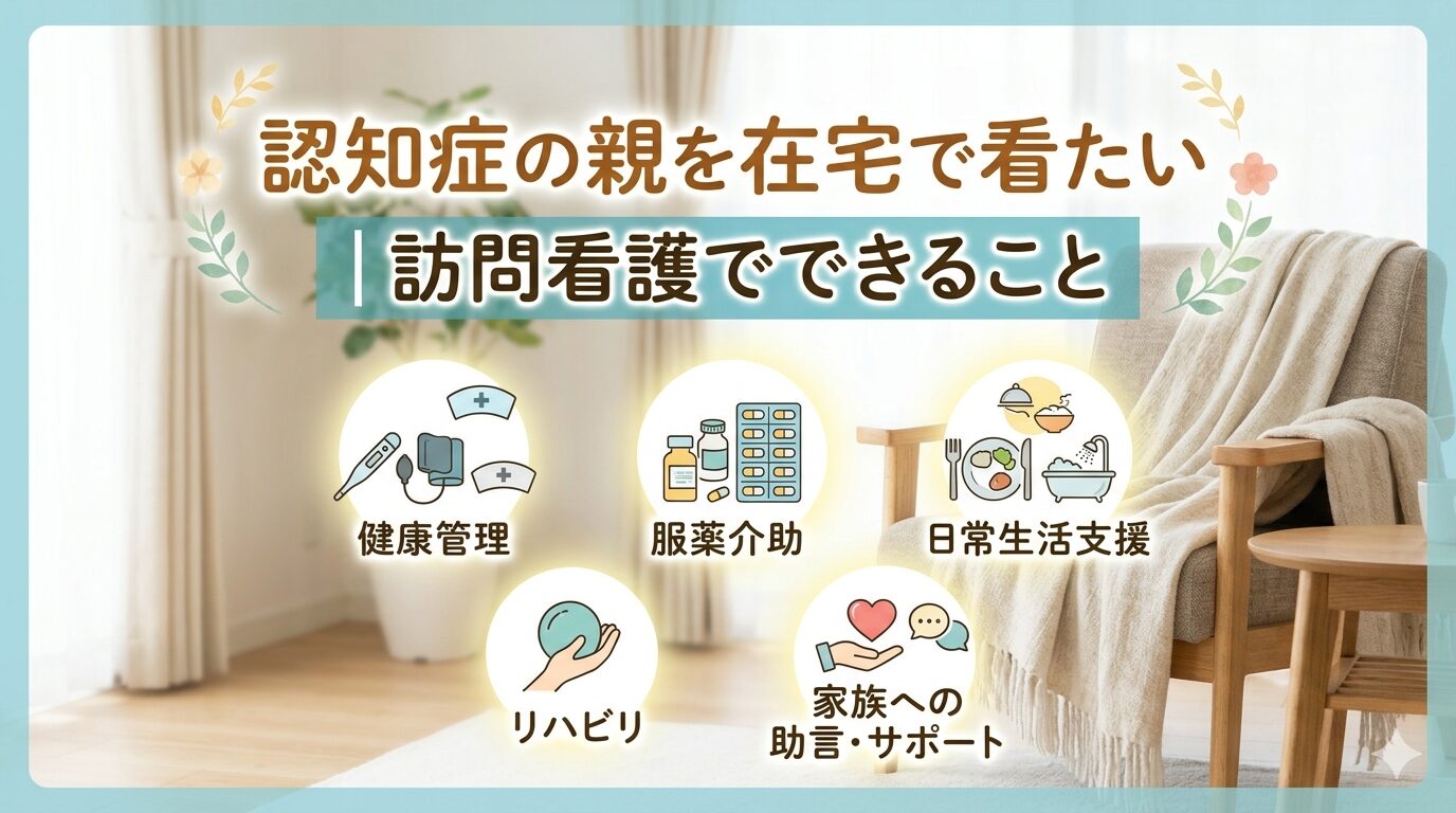 訪問看護は、主治医の指示のもと、看護師がご自宅を定期的に訪問して医療・看護を提供するサービスです。認知症の在宅介護において、訪問看護師は単なる体調管理にとどまらず、多岐にわたるサポートを担います。