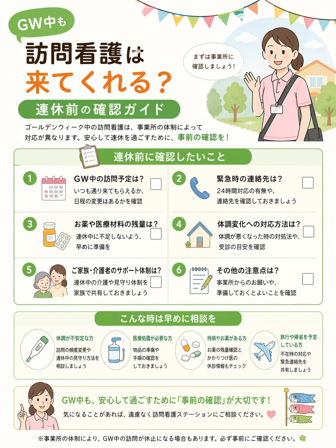 「GW中は来てもらえない」という思い込みは必要ありません。まずは担当の訪問看護師に確認することが、一番確実な方法です。