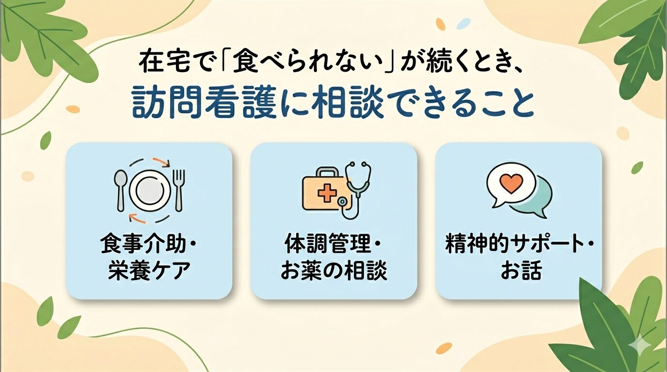 Q. 訪問看護師に「食べられない」と相談していいのですか? A. はい、ぜひご相談ください。食事の問題は訪問看護師が対応できる重要なテーマの一つです。状態の確認から必要な専門職へのつなぎまで、幅広く対応できます。「こんなことで相談してもいいのか」とご遠慮なく、気になった段階でお声がけください。