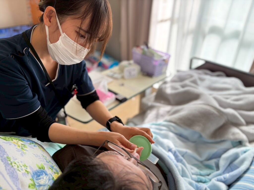 口腔ケアとは、口の中を清潔に保つケアです。口腔内の細菌は誤嚥性肺炎(誤嚥した食べ物とともに細菌が肺に入ることで起こる肺炎)の原因になります。訪問看護師は、唾液腺マッサージや口腔ケアの実施、ご家族への指導も行います。
